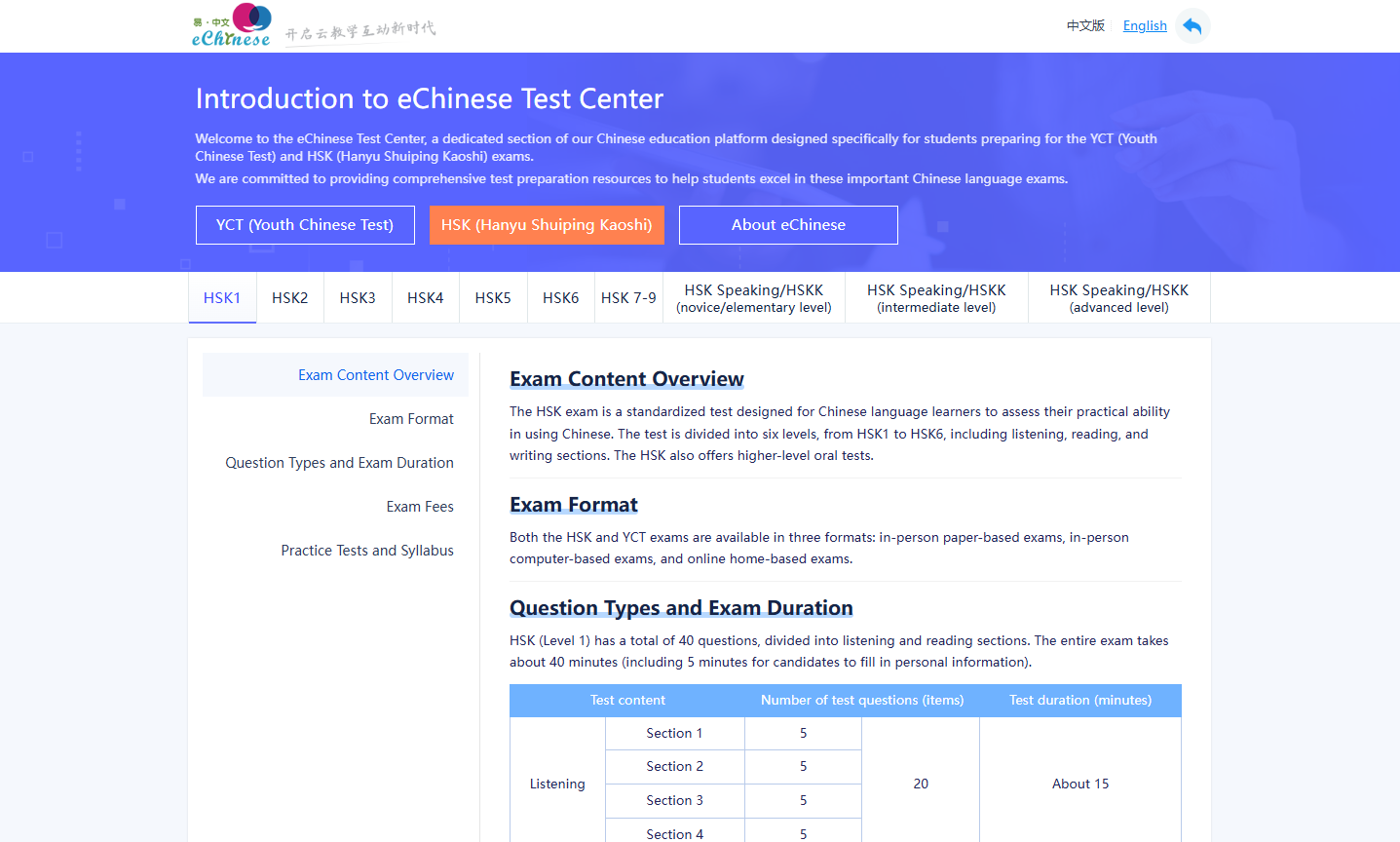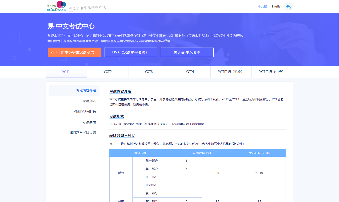 为帮助广大师生准备和参与中文水平考试,易·中文在教学平台内打造了易·中文考试中心板块,提供中文、英文版本的考试资讯。该板块专门服务于备考 YCT和 HSK考试的学生,为他们提供全面的考试信息和资源,帮助学生在这两项重要的中文水平考试中取得优异成绩,欢迎易·中文用户、国际中文教育工作者、中文学习者们访问、浏览和使用。